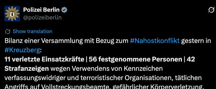 Die “offene und tolerante Gesellschaft” die gerne “Nie wieder!” brüllt, aber bei direkter Konfrontation mit “Irgendwie schon wieder” Ausflüchte und Relativierungen vorschickt, um ihr moralisches Dilemma zu kaschieren. Eine Berliner Polizei, die öffentliche Kundgebungen noch NICHT EINMAL BEIM NAMEN NENNT, um deren Sache nicht auch noch zu befeuern.